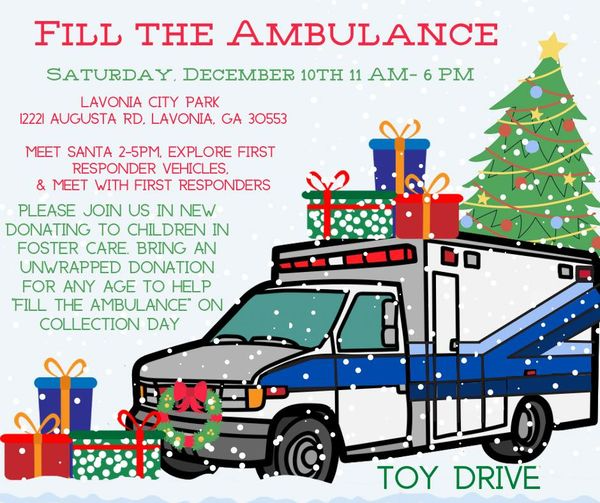 Fill the Ambulance will take place on Saturday, December 10th from 11 AM – 6 PM and will be held at the Lavonia City Park behind the Lavonia Fire Department.