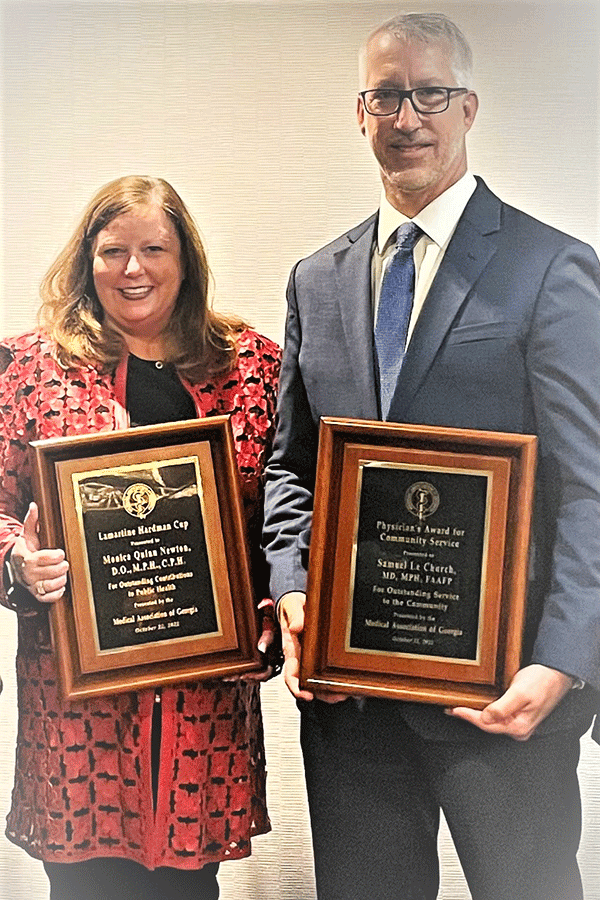 Dr. Monica Newton and Dr. Samuel Le Church, Family Medicine physicians at Northeast Georgia Medical Center (NGMC), were recently honored with two of the highest honors given by the Medical Association of Georgia (MAG) at their annual House of Delegates meeting in Savannah.